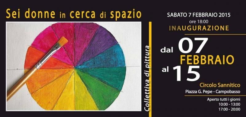 Campobasso - Si chiama "Sei donne in cerca di spazio", la kermesse di pittura rosa che a partire dal prossimo 7 febbraio e fino a domenica 15 febbraio, sarà possibile visitare presso i locali del Circolo Sannitico di Campobasso. Le protagonoste della manifestazione organizzata dall'Associazione "Campobasso Insieme" presieduta da Claudia Mistichelli, saranno appunto sei donne: Enza Conte, Giù Maddalena, Luigia Rotoletti, Marisa Serpone, Gabriella Tomaro e Susi Vergato.