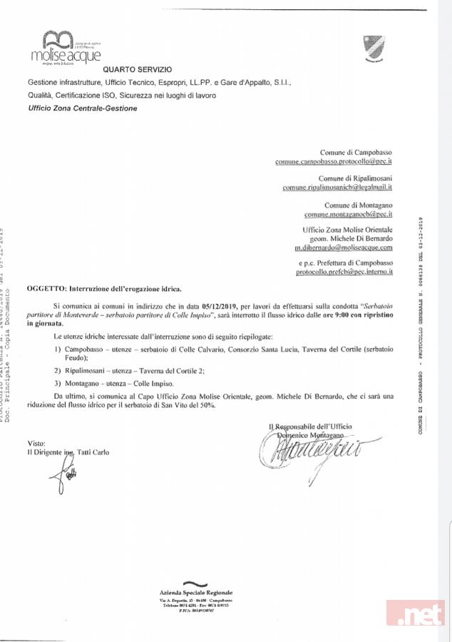 Trasmettiamo in allegato la comunicazione di Molise Acque relativa ai lavori che verranno compiuti domani, giovedì 5/12/2019, dall'azienda su serbatoio partitore di Monteverde - serbatoio partitore di Colle Impiso.
