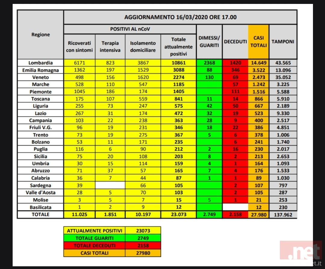 Come ogni sera alle ore 18 é arrivato il bollettino del Ministero della Sanità sui contagi Regione per regione.