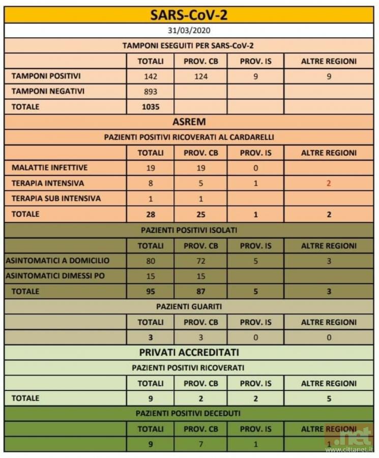 Dove si parla di 144 contagi totali che tengono conto anche dei due di Bergamo. In quelli del Molise risultano essere 142. Le persone contagiate sono 124 della provincia di Campobasso, 9 di quella di Isernia e 9 di altre regioni. 8 sono le persone ricoverate in terapia intensiva e 1 in subintensiva. Diciannove i ricoveri in malattie intensive al Cardarelli tutti della provincia di Campobasso. I pazienti asintomatici sono 95. 80 che si curano da casa di cui 72 della provincia di Campobasso e 5 di quella di Isernia e 3 di altre regioni. Gli asintomatici dimessi dall' ospedale sono 15.