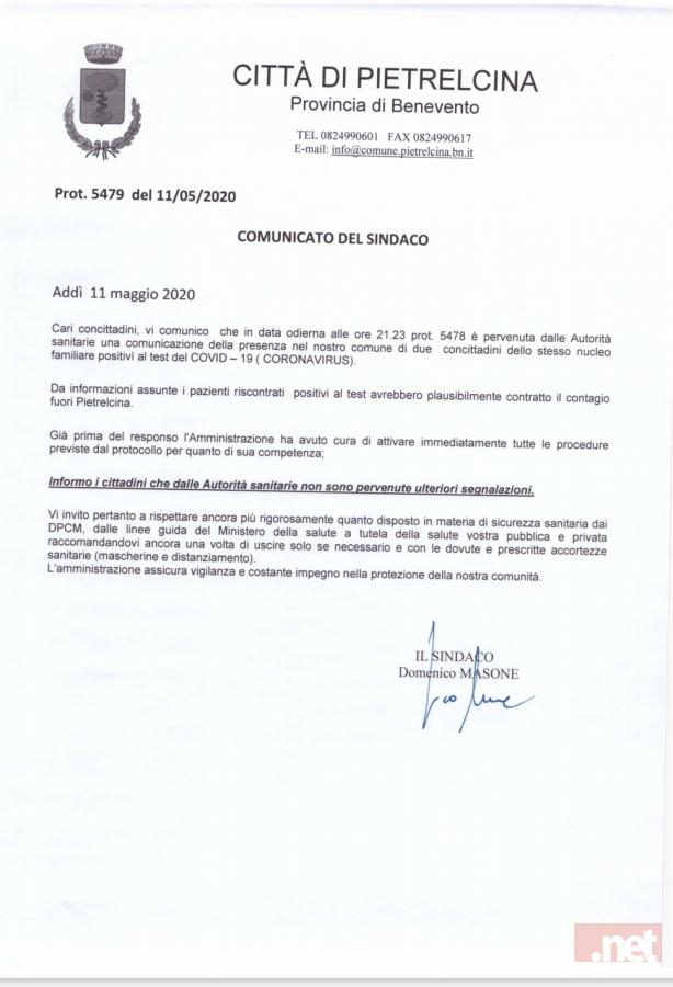 " Cari concittadini - si legge nella nota del primo cittadino- vi comunico che in data odierna alle ore 21.23 prot. 5478 è pervenuta dalle Autorità sanitarie una comunicazione della presenza nel nostro comune di due concittadini dello stesso nucleo familiare positivì al test del COVID – 19 (CORONAVIRUS).
