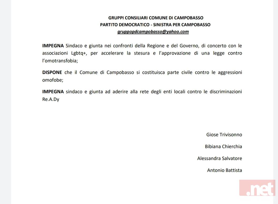 L' argomento scaturiva dall'aggressione del ragazzo molisano sulle strade del capoluogo abruzzese. Ci riprova il Comune di Campobasso con una mozione a prima firma del capogruppo PD Giose Trivisonno e voluta da tutto il gruppo composto da Bibiana Chierchia, Antonio Battista e Alessandra Salvatore.