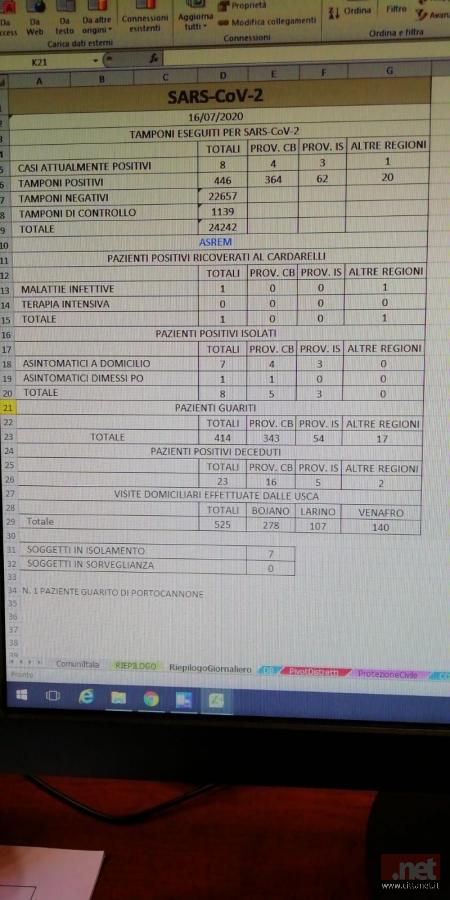 Su 161 tamponi processati nessun nuovo positivo ma un guarito a Portocannone. Era l' ultimo positivo del bassomolise. Sono solo 8 ora i casi attivi di cui 3 a Campobasso, 2 a Isernia, uno a Macchiagodena e uno a San Giuliano del Sannio. L' ottavo caso è una donna campana ricoverata in malattie infettive.