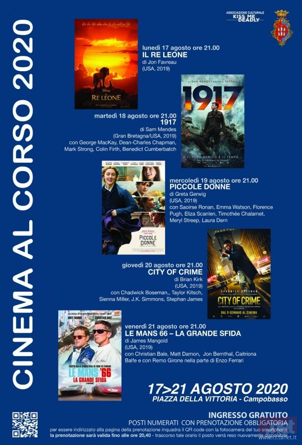 Torna, anche quest'estate, sempre in pieno centro cittadino, la rassegna cinematografica all'aperto “Cinema al Corso”, curata per il secondo anno consecutivo da Kiss Me Deadly e che proporrà, dal 17 al 21 agosto, ben cinque serate con la proiezione, sempre dalle ore 21.00 nell’ordine, di Il Re Leone (17 agosto), 1917 (18 agosto), Piccole donne (19 agosto), City of crime (20 agosto), Le Mans: la grande sfida (21 agosto).