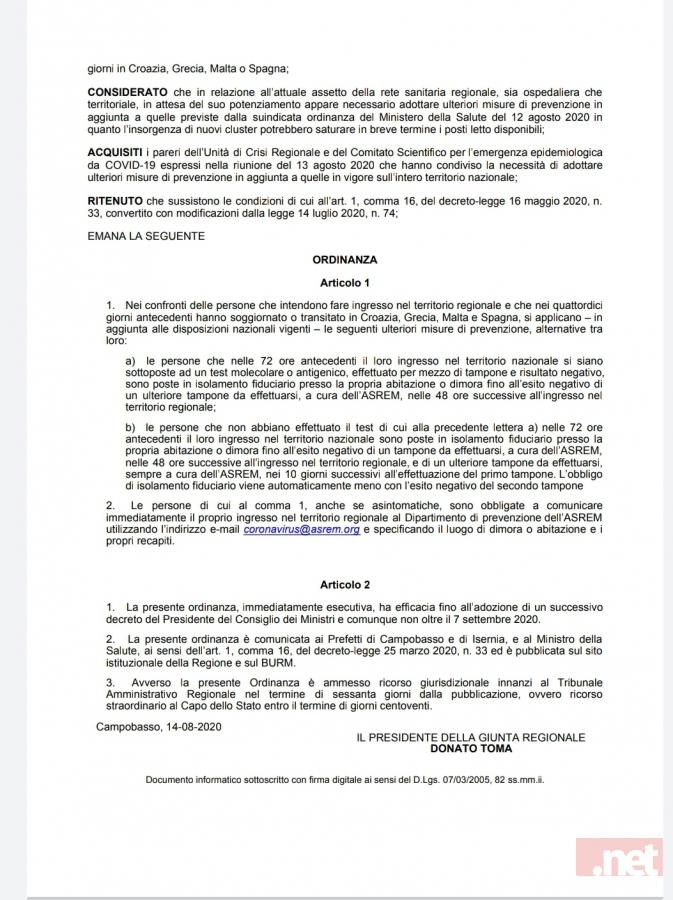 Il presidente della Regione Molise ha emanato una nuova ordinanza avente ad oggetto ulteriori misure per la prevenzione e gestione dell’emergenza epidemiologica da Covid-19.